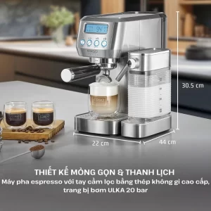 - ☕ Hệ thống bơm áp lực cao (từ 15–20 bar) giúp chiết xuất cà phê tối đa hương vị, tạo lớp crema dày, mịn.