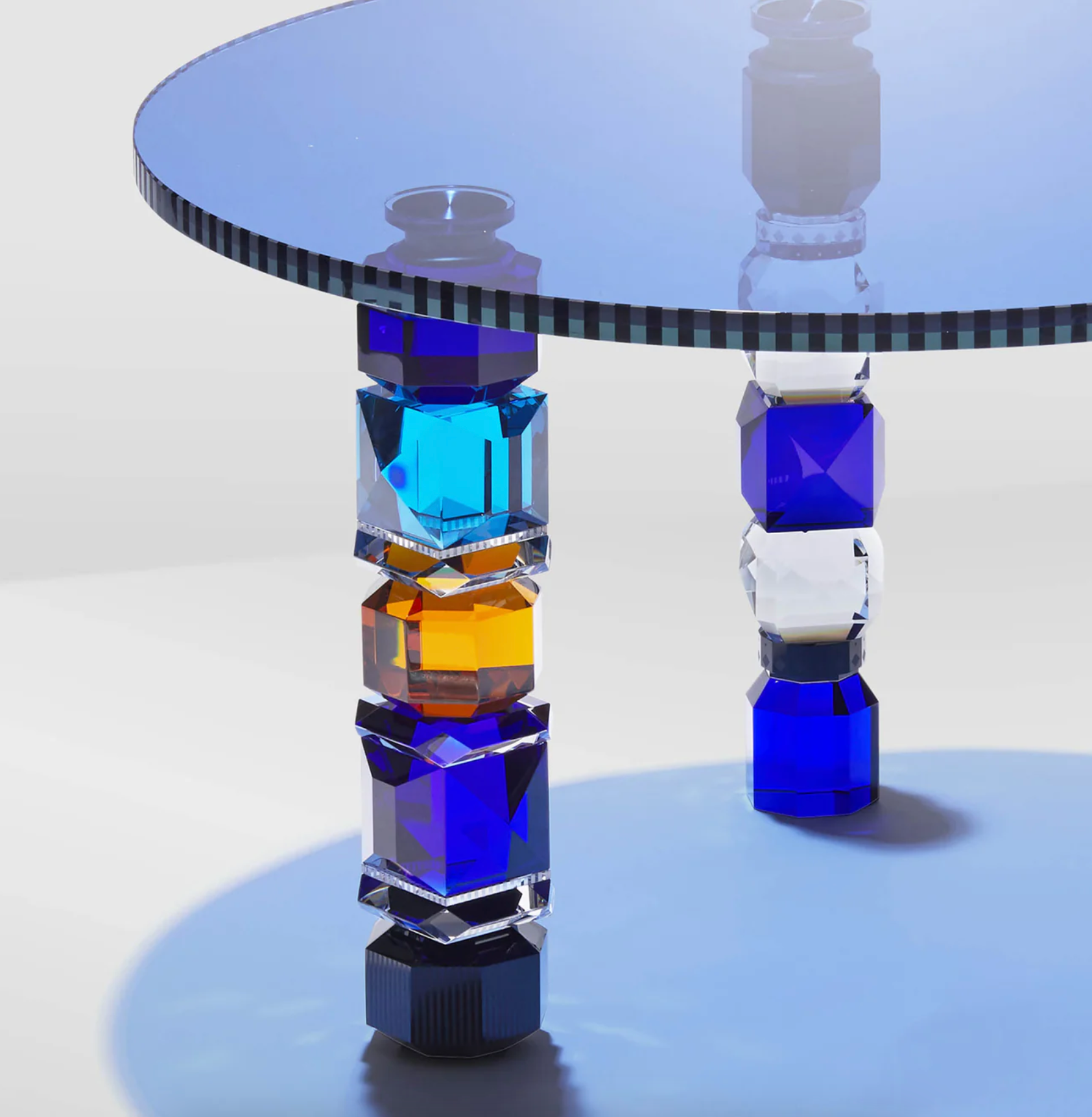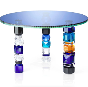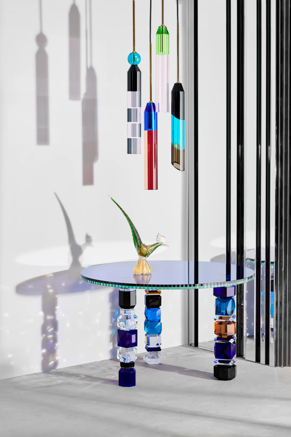 • Ba chân bàn có hình dạng hình học màu sắc, được trang trí bằng các phụ kiện đồng, kết hợp tinh tế với mặt bàn màu xanh lá cây có các vạch khắc sâu. Với bàn này, phong cách đa dạng gặp gỡ sự lộng lẫy kì thú.