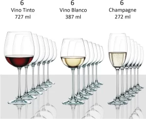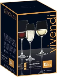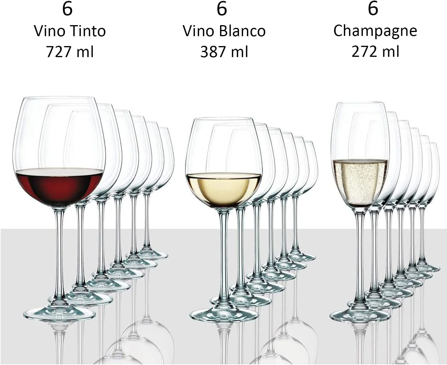 Bộ 18 chiếc bao gồm nhiều loại ly khác nhau, đáp ứng nhu cầu phục vụ rượu vang đỏ, vang trắng và champagne, đem lại sự linh hoạt khi phục vụ.