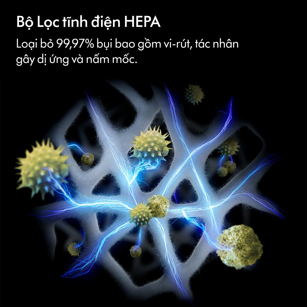 • Bộ lọc tĩnh điện HEPA 360° giữ lại 99,97% hạt siêu mịn chỉ 0,3 micron